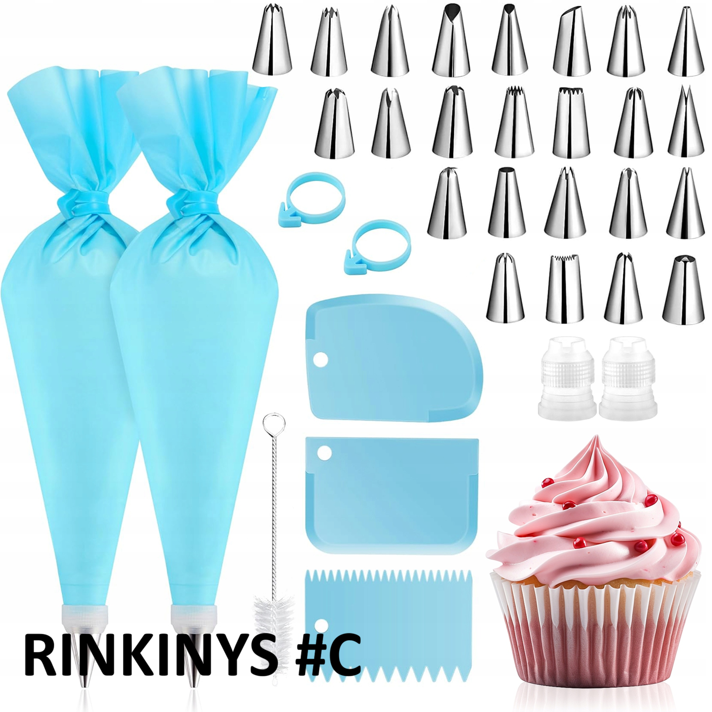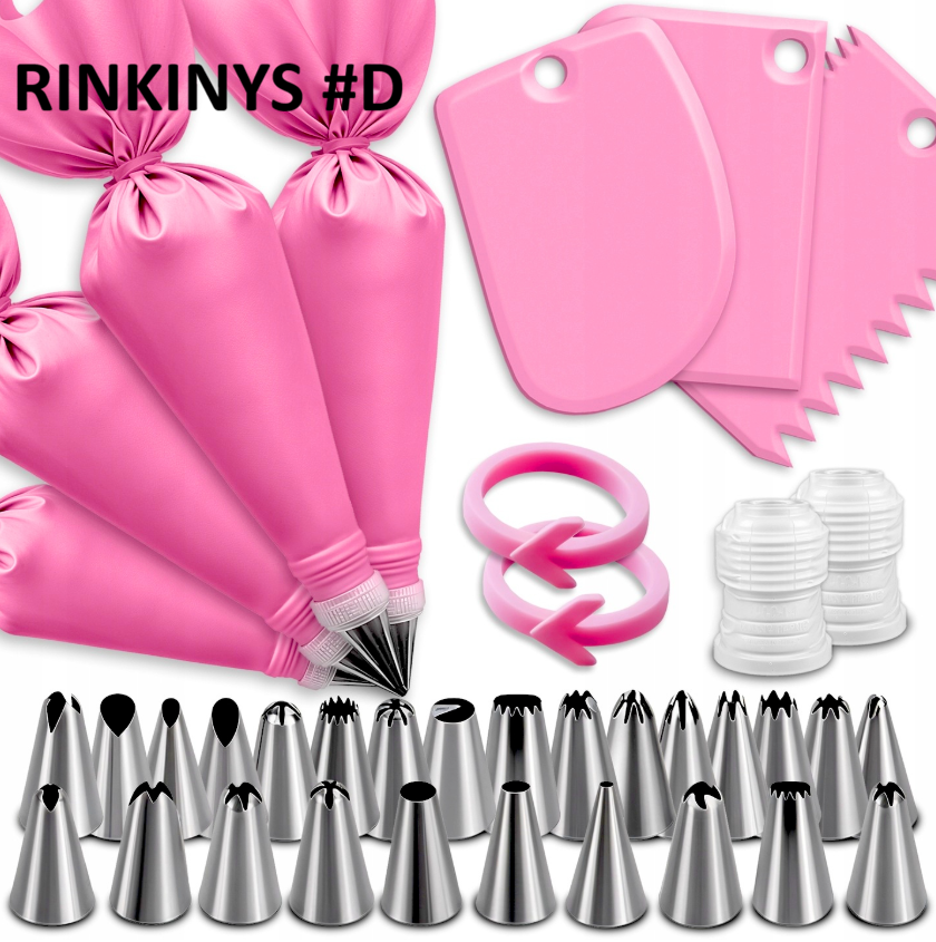 Konditerijos dekoravimo rinkinys su silikonine rankove ir nerūdijančio plieno antgaliais leidžia lengvai kurti tortų, pyragų ar keksiukų puošybą kaip iš konditerijos vitrinos